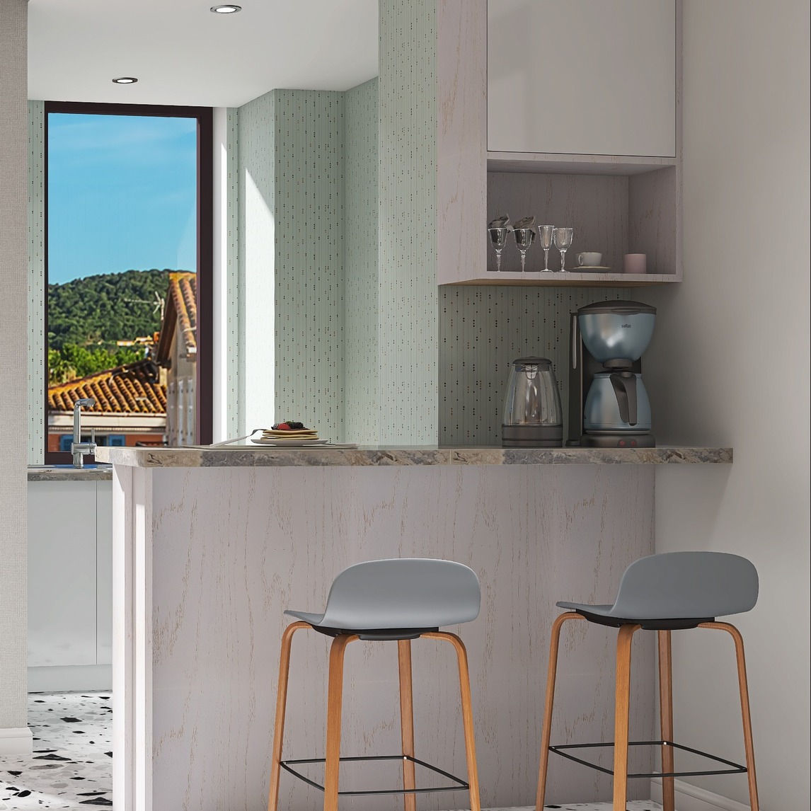 一室一厅的房子,打通厨房的墙,做成开放式厨房,做一个简单的吧台,既解决了吃饭的问题,又增加了一个吧台的功能。地砖配的是流行的水磨石地砖,再配上黄色的懒人塌,让空间更加文艺。