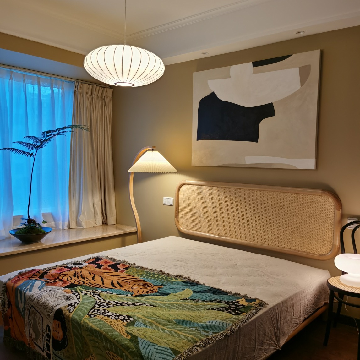 【原创设计 · Bocean 】用大地色搭配出简洁质朴的长辈房,中古落地灯搭配中式盆栽,抽象的墙画更显优雅稳重,床头的编藤,中古的椅子在温暖的光影下显露出各自的肌理,透过光影的变化,沉稳一辈的儒雅和大...展开