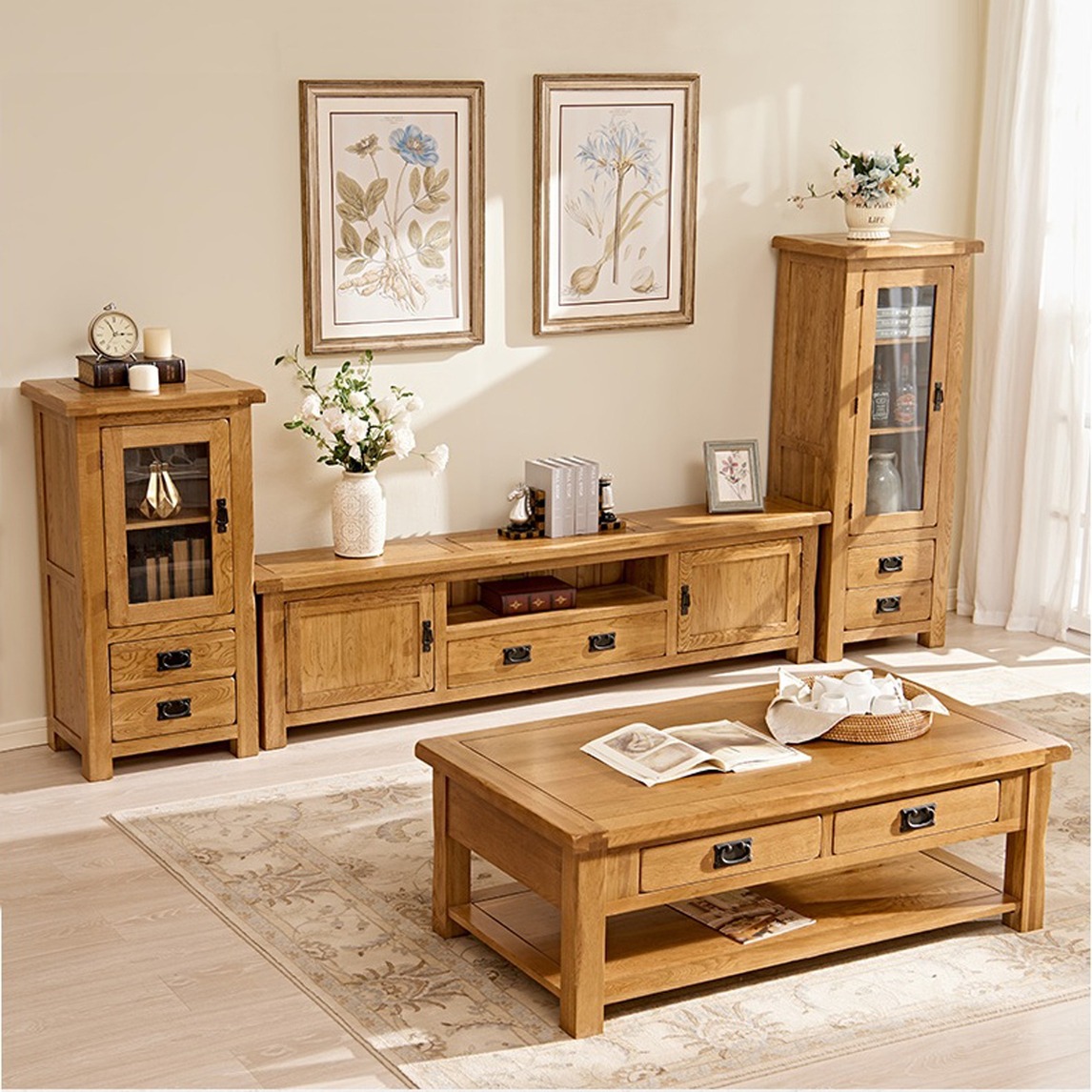 空间中的电视柜采用北美进口的橡木打造,十足的用料彰显厚重质感,复古拉手设计耐看不过时,一整套有着蜂蜜一般温柔色泽的家具搭配,将英式的经典搬进你家!