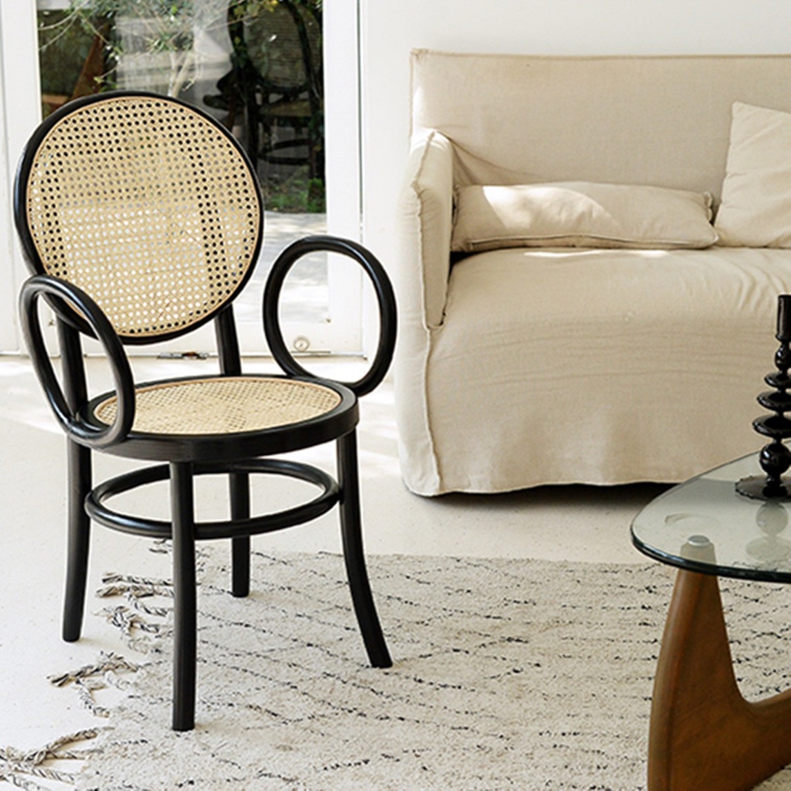 线条优美,简洁清爽,非常有通透感。座面和靠面均使用天然藤条编织,美观透气。随着使用,会让色泽越来越迷人。藤面部分采用非常结实的八角眼编法,让凳子整体更轻巧。