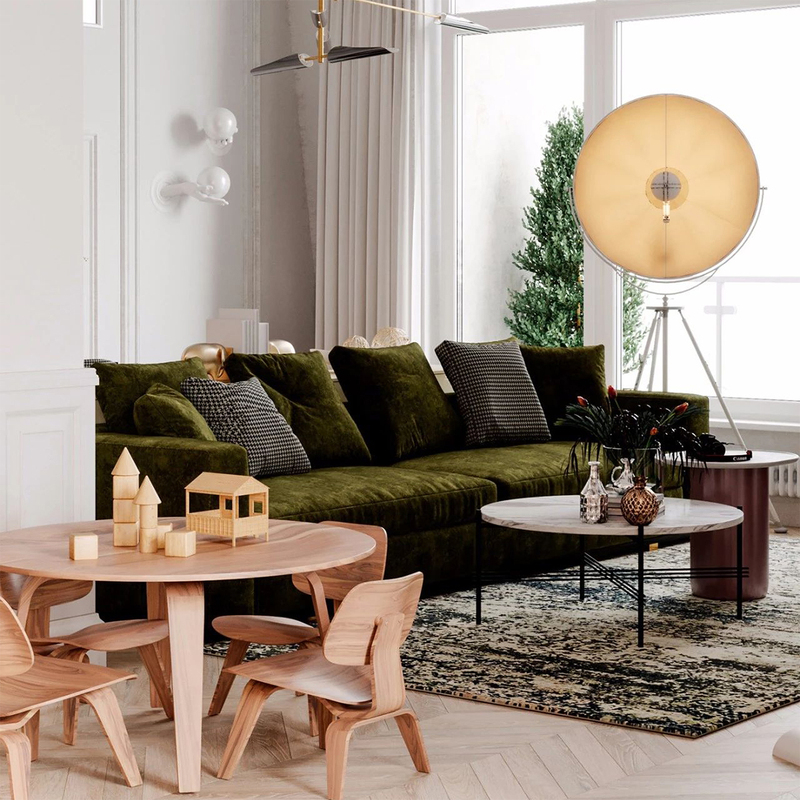 装修客厅时,不一定要严格选择北欧或者欧式等固定的装修风格。根据自己的喜好来混搭,反而能出效果。比如说,现代风的沙发搭配复古的茶几,还有北欧风的儿童桌,给你想要的森系感觉。