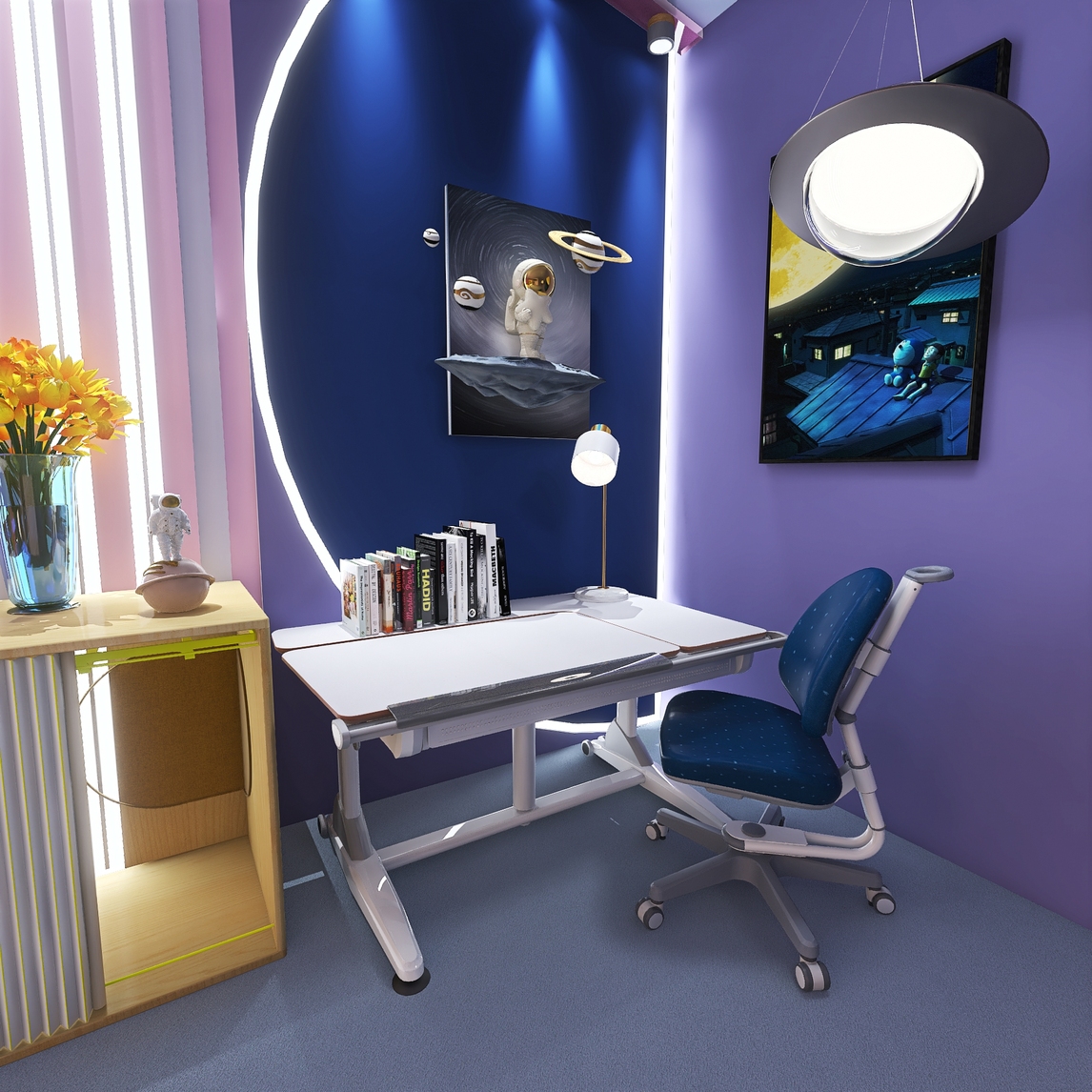 房间用蓝紫色打底,搭配装饰,把整个房间布置成孩子喜欢的风格,家具选择环保材质,放心让孩子在这个宇宙中快乐成长