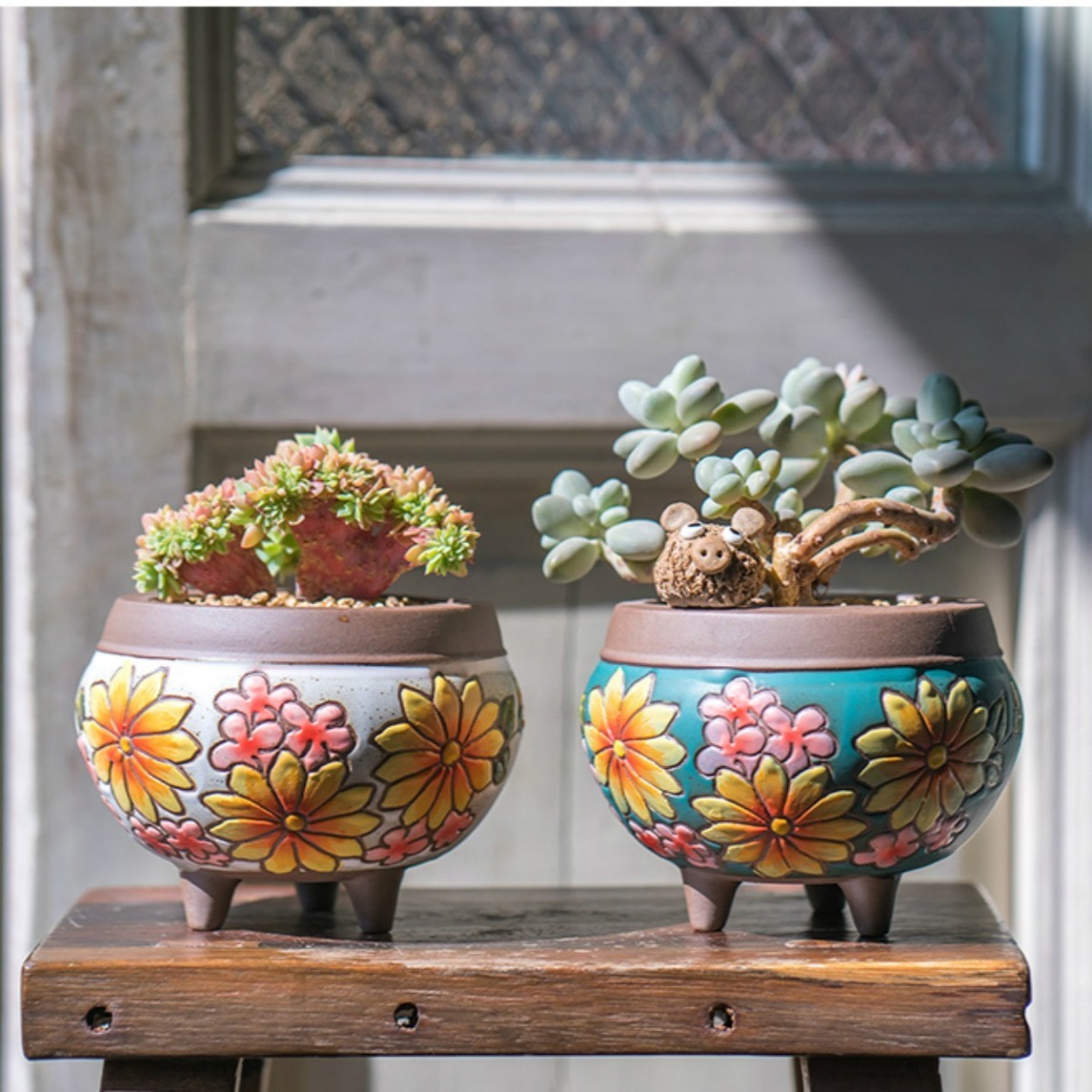 以绚丽多彩的手绘陶瓷花盆作为花器,将多肉衬托的娇艳无比,堪称颜值逆天!花盆上的花纹图案设计,增加 空间的格调感,随意放在哪个角落都自成风景。