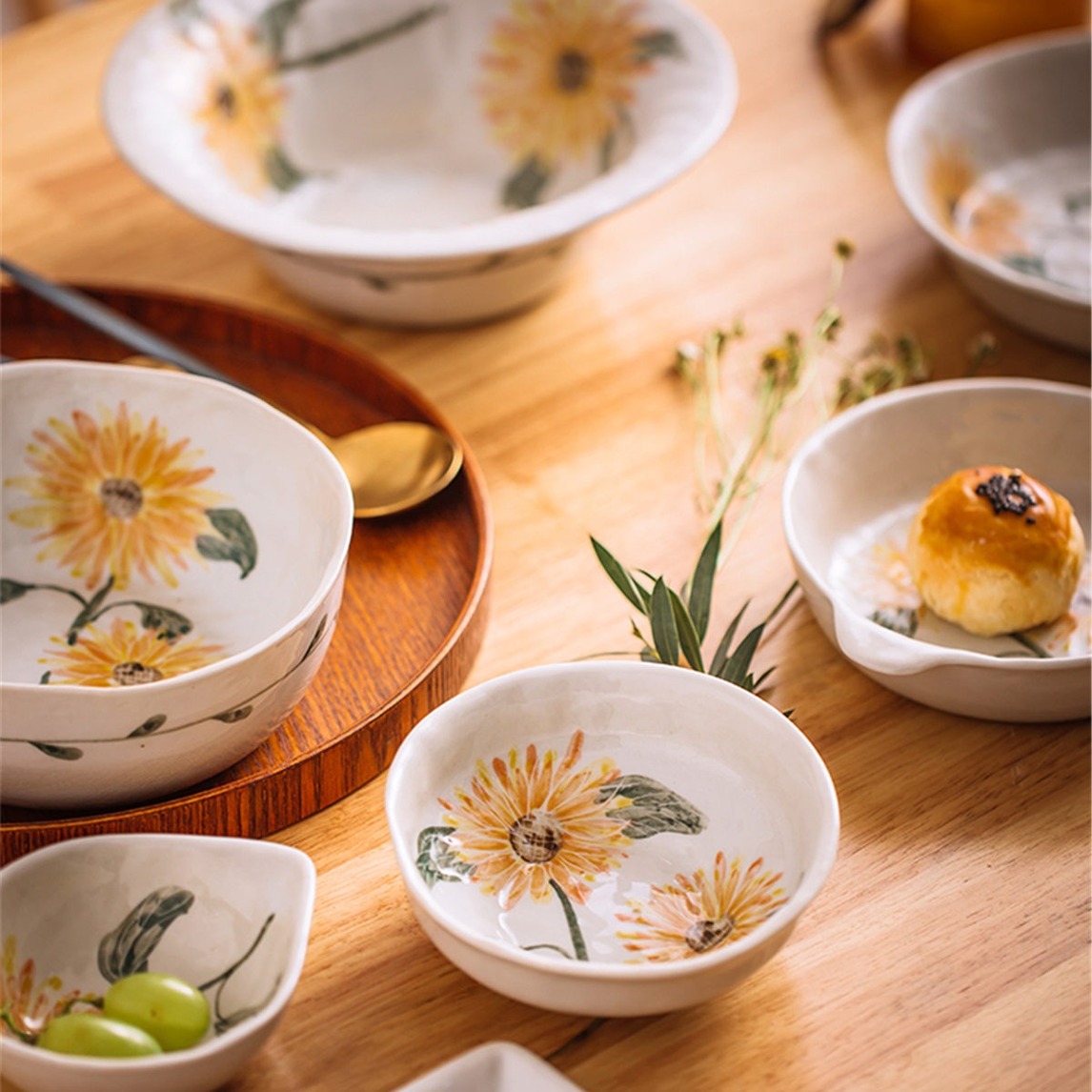 阳光的手绘向日葵,在陶瓷碗上绽放,为餐桌带来满满元气,吃饭也变得浪漫有情调;质感釉下彩工艺制作,不用担心掉色。