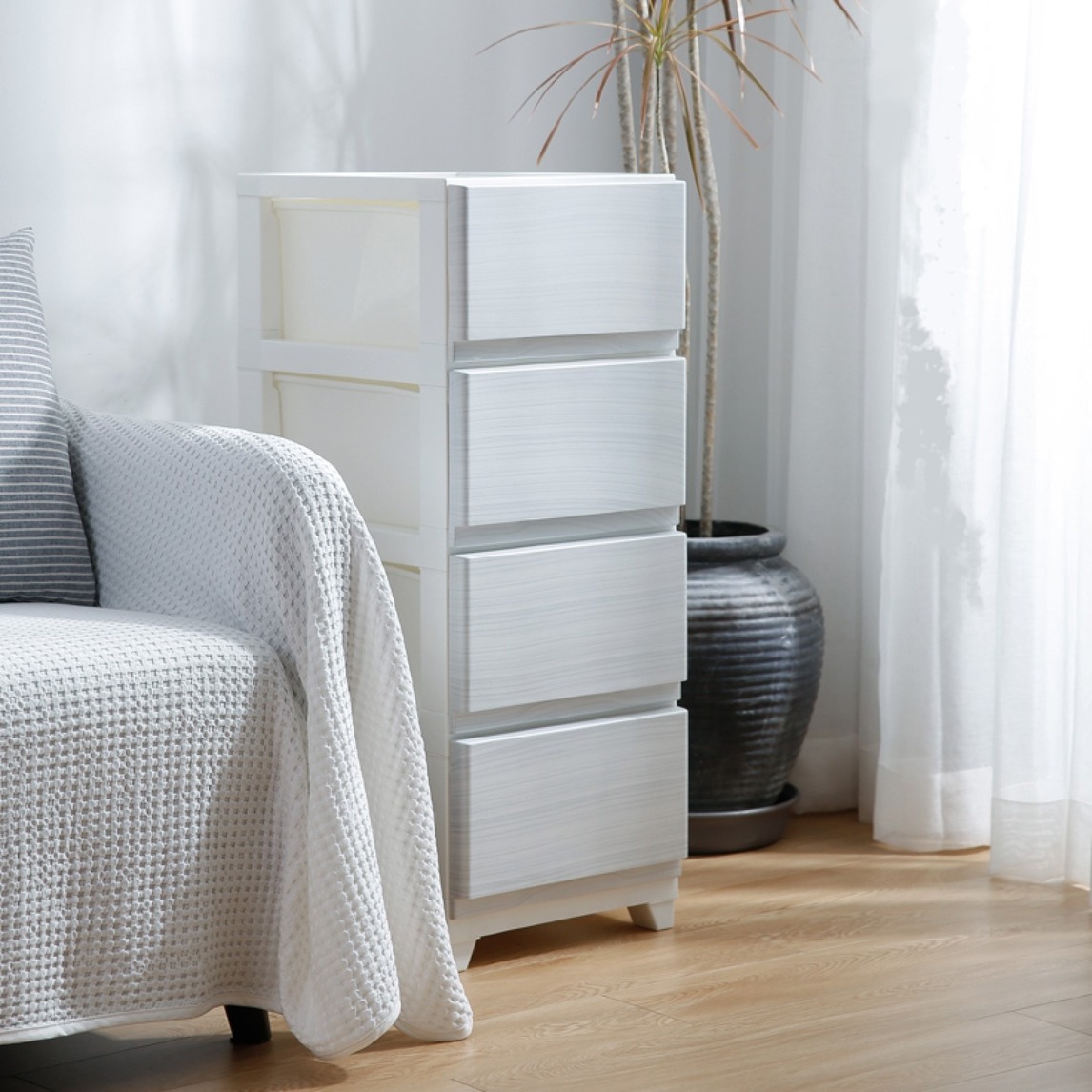 这款收纳柜有原木色木纹款和雅致灰色木纹款,简约淡雅,能搭配多种室内装修风格。有多层款式,可根据家中空间实际大小来搭配。比如,至于床头,收纳卧室的琐碎。既能收纳物品又能装饰空间。带来恰到好处的收纳体验。