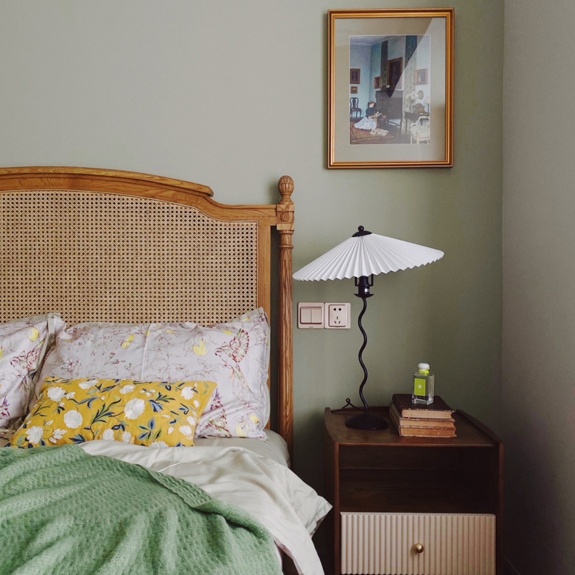 因卧室面积不大,又想要复古风,故而没有大面积的使用深色调,搭配豆绿毛毯,起到中和作用,进入卧室后没有丝毫压抑感,就这样刚刚好~