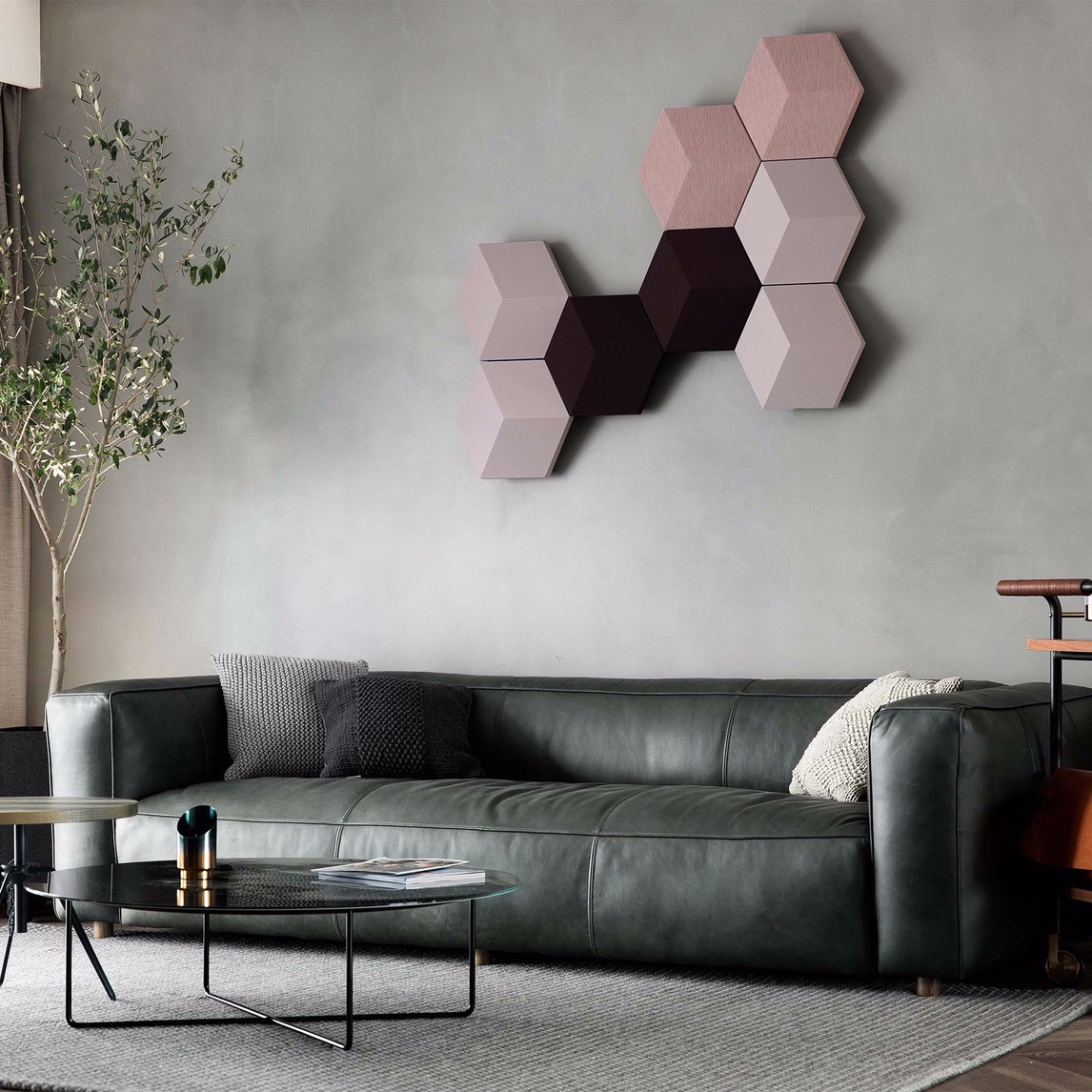 整个客厅以深色为主,饱满厚实的真皮沙发,搭配高低组合茶几,简约中透着优雅之感,沙发背景墙以几何壁饰装饰,点缀空间的同时,又不失艺术感。