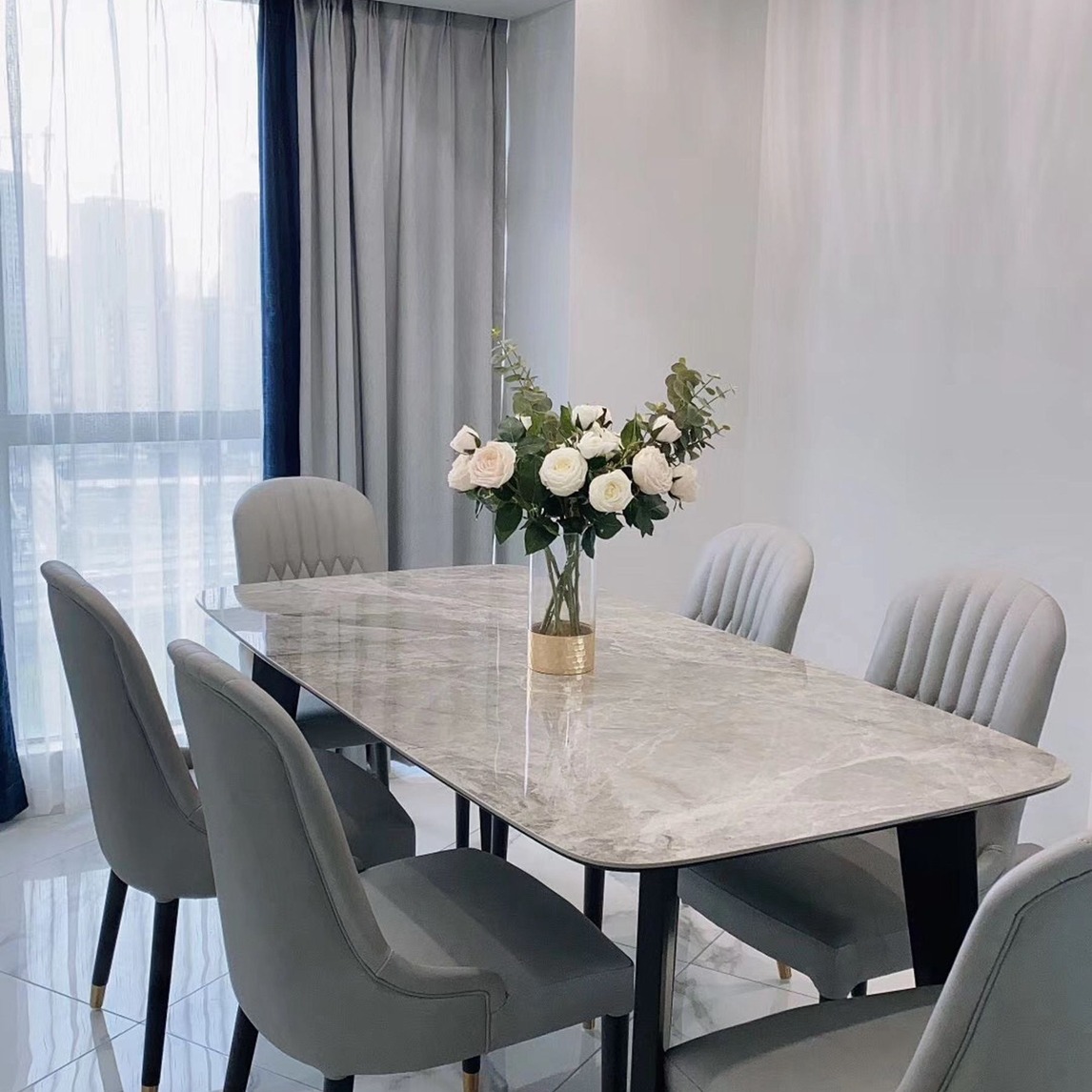 大理石餐桌椅,大理石和金属的巧妙结合,简约轻奢,还非常的耐用,提升餐厅格调感。 装饰假花,花束的加入,空间瞬间变得有活力。 免打孔窗帘,遮光效果好,免打孔设计,方便安装。
