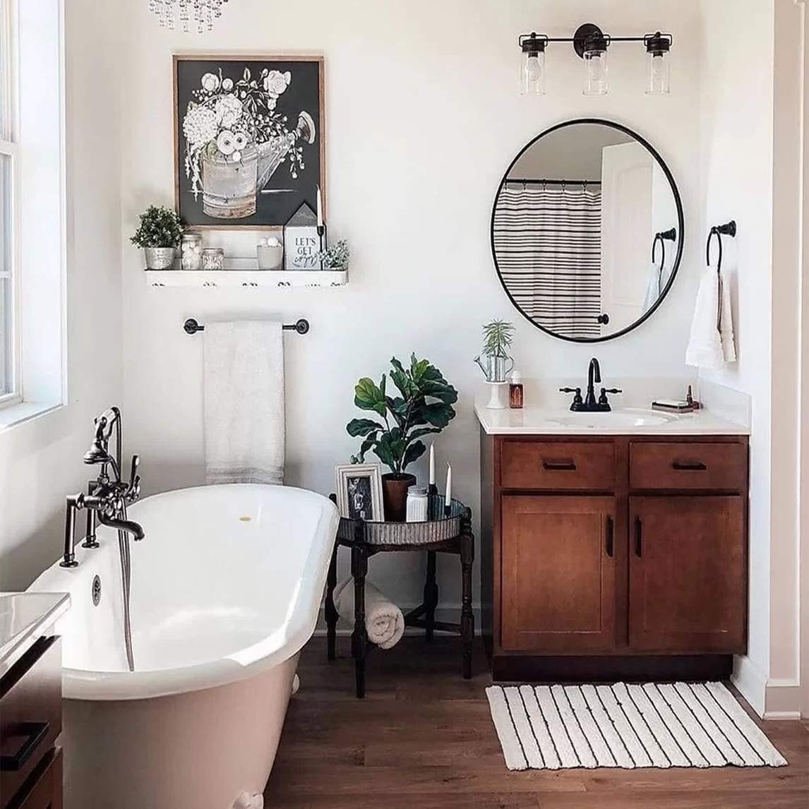整个浴室是简约棕白调,圆形的镜子简直就是格调塑造神奇,欧式简约风的白色浴缸也搭配的恰到好处,四脚的局部是很古典的设计,独特又典雅,有一种古典的宫廷韵味!白棕的经典配色也是极为端庄,有一种干净利落且精致...展开