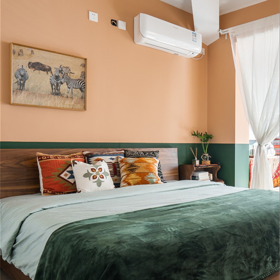 【原创设计·意外之外空间实验室】屋主追求努力工作努力玩的极致生活体验,想把自己游览各国的经历都装进自己的小天地,墨绿与脏橘的碰撞仿佛伸手就是摩洛哥温暖的日光,几件独特单品的加持与点缀就足以让这个房间充...展开