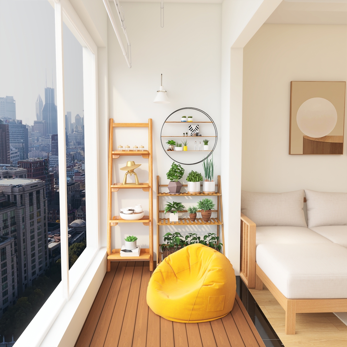 多层的实木置物架,让绿植盆栽都能够很好收纳,利用墙顶空间收纳衣物,拒绝空间杂乱,休闲的时候还可以靠在豆袋椅上休息,心情都变得好起来。