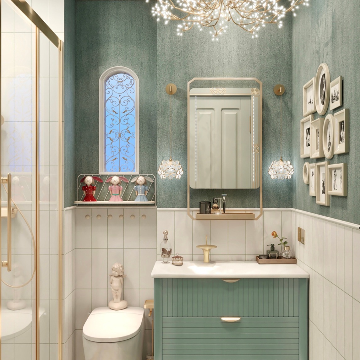 入门第一眼就被这个绿色的轻法式浴室柜所惊艳,一眼就看到了这个浴室镜子两侧的超仙气琉璃花瓣灯,铜质的吊灯运用在浴室中,是营造氛围的好帮手。各种可爱的天使娃娃雕塑摆件和智能化的沐浴家电,一种贵族沐浴的场景...展开