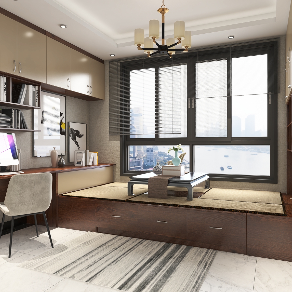榻榻米茶室,也可以作为会客厅。在新中式风格的基础上,加入一些现代元素,简单的同时又不失内敛。榻榻米能够有效的利用空间,以木纹色为主色调,给人一种宁静舒适的感觉。