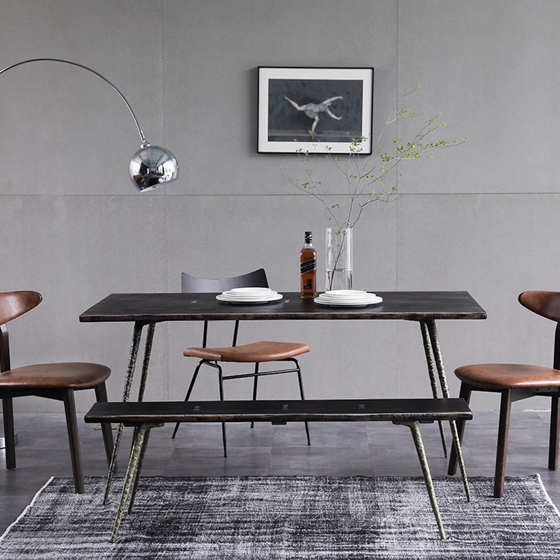 餐桌和长凳采用进口橡木+锻造的铸铁桌腿,烟熏黑设计有着浓郁的工业气息。餐厅家具整体以干净的线条呈现出独特的美感,在日常生活中让人百看不厌。