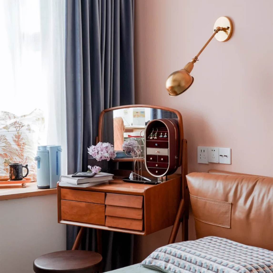 橘粉的墙色和雾霾蓝丝绒窗帘碰撞,柔和又沉静。棕色的皮质床、红色丝绒的复古首饰盒,都是暖暖的色调。靠着柔和的皮质床头,刷刷手机、看看kindle阅读,喝一杯温热的蜂蜜茶水,都让人感觉放松和享受。