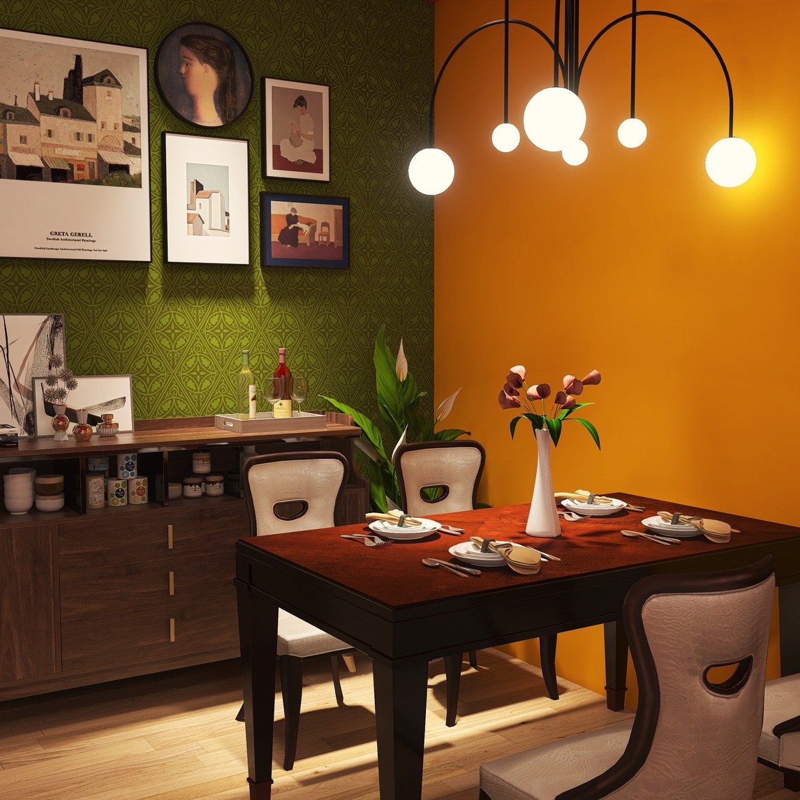 餐厅以黄绿两色相碰撞,为了与客厅相连接,餐厅也是采用烫金花纹壁纸铺满。主要家具以实木家具为主,增加质感,绿植加以修饰