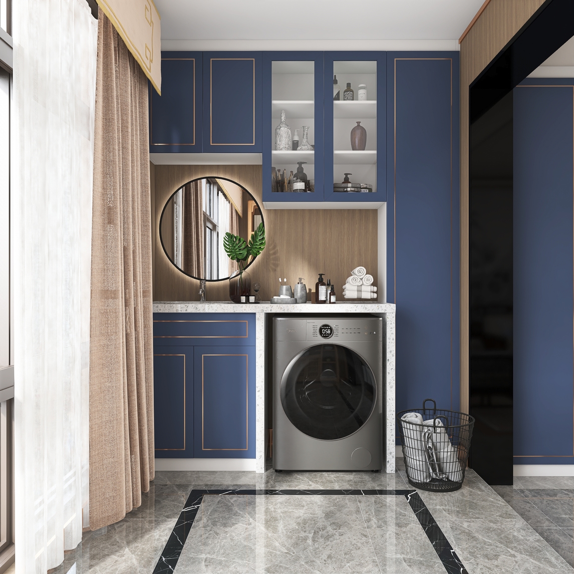 阳台可供利用的空间也蛮多的。阳台可以考虑洗衣台+吊柜设计,底部设计洗衣台,搭配墙面组合式吊柜。合理利用墙面空间收纳,美观实用。