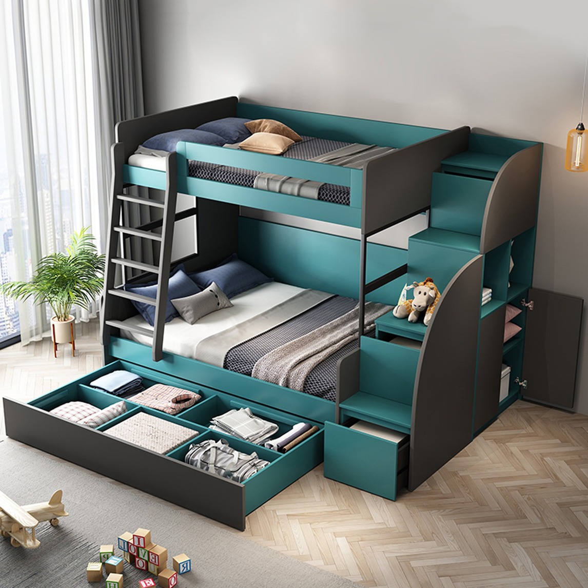 专为小户型而生,多功能高低床,一床多用,衣柜、书柜储物柜,多合一,节省空间,睡觉学习两不误,现代二胎儿童房值得拥有。