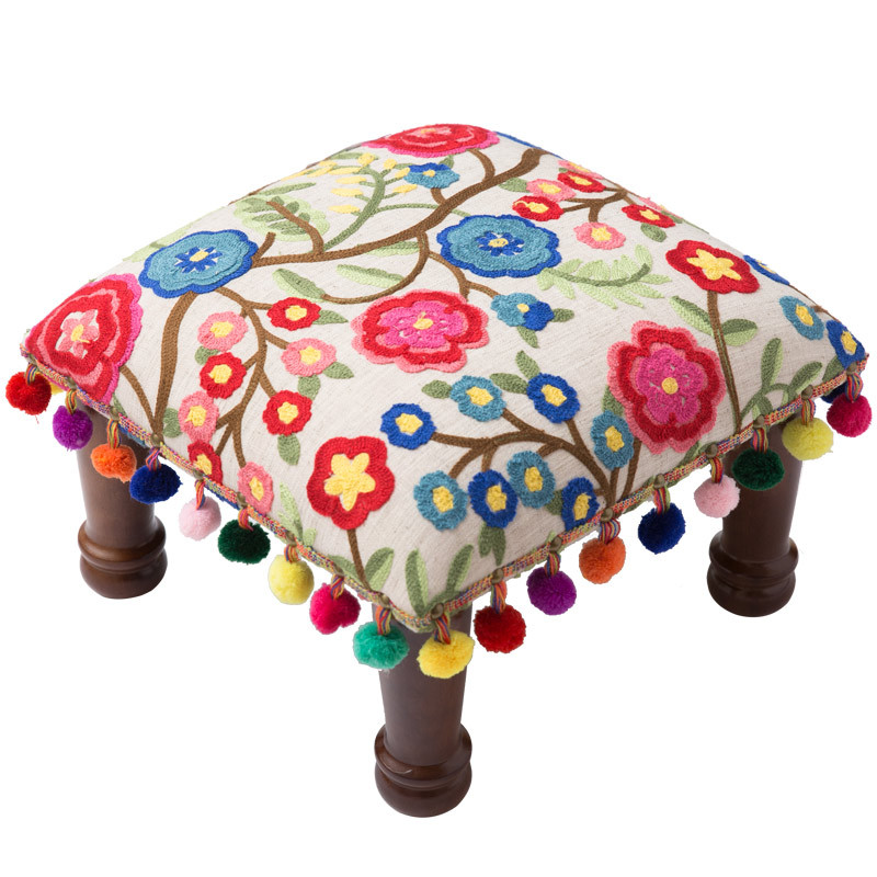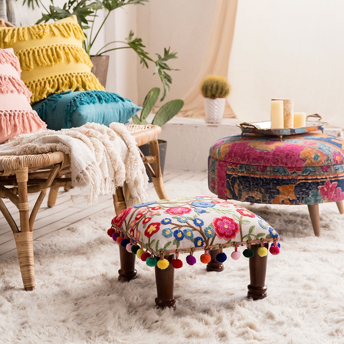 一款软包凳子,采用棉布立体绣花工艺,满满的波西米亚风,一圈小毛球的设计更显异国风情格调,放在客厅一点都不突兀。
