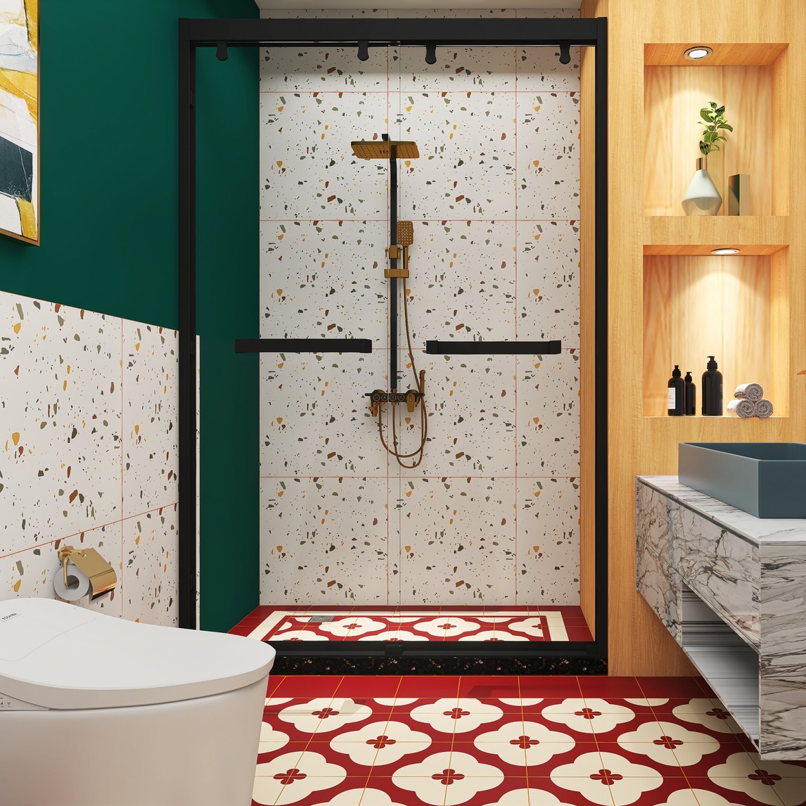 淋浴房的地面选择这样拼花设计,好看又美观,中间花色,四边围边,形成一个围边拼花的设计,防滑耐磨,网红中国红花砖