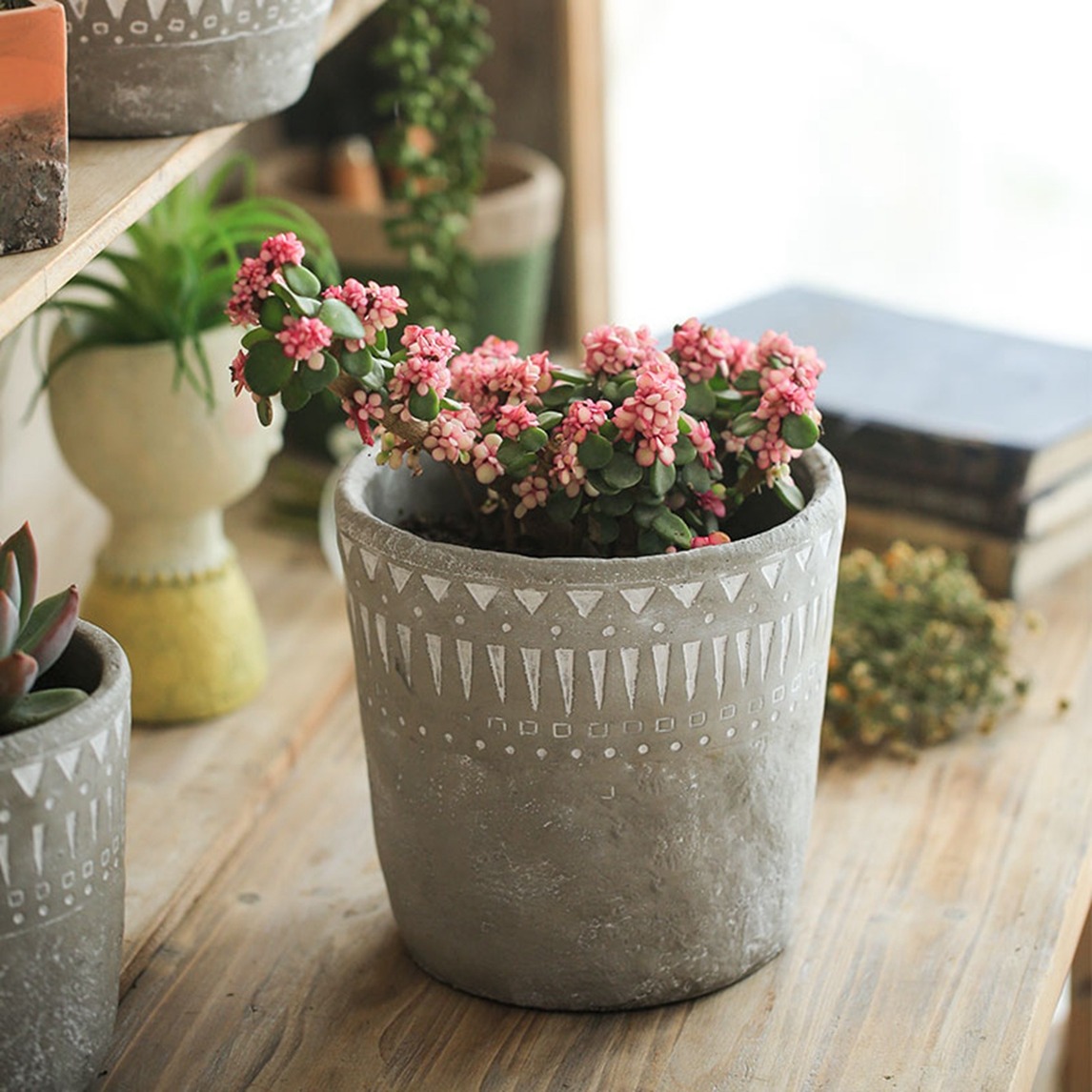 一款水泥色的非洲元素花盆,透着满满的异域感。搭配好看的植物,又是一个漂亮的景观,效果非常不错,点缀你家的阳台。