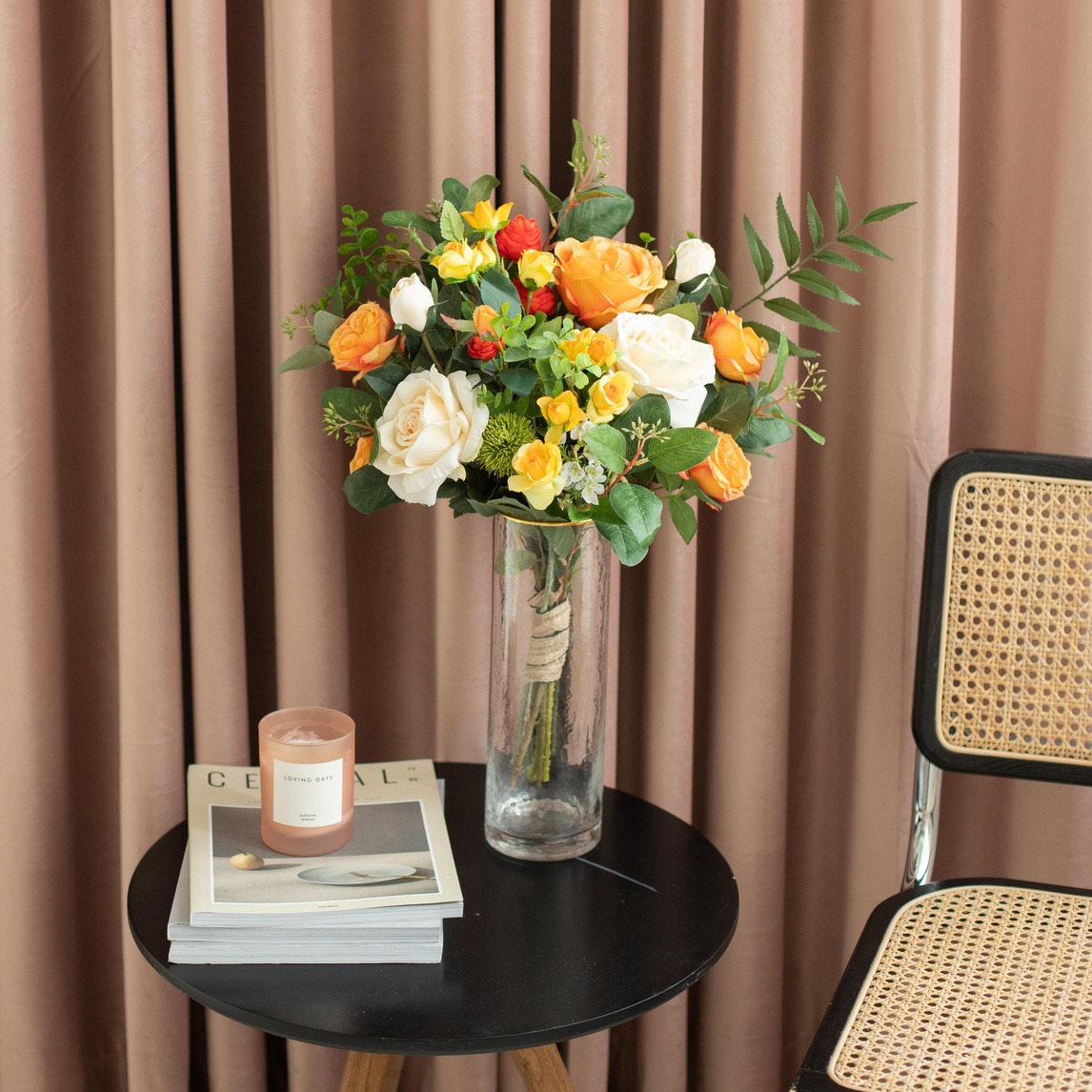 明亮优雅的晴诗花束,搭配透明干净的直筒玻璃花器,有一种晶莹剔透的质感。在柔和豆沙色背景的衬托下,显得精气神十足。