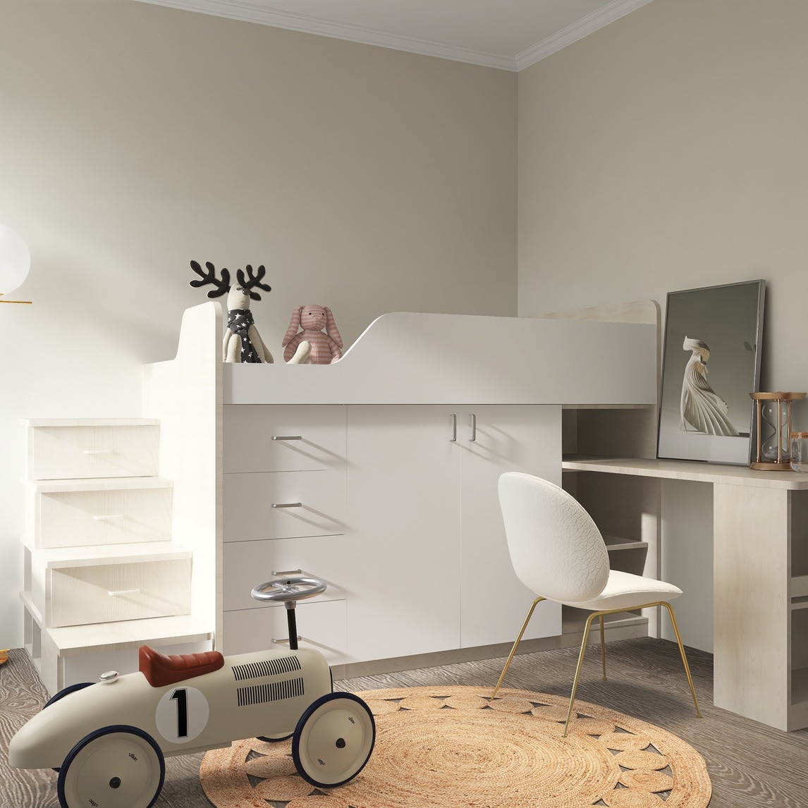 二胎来了,儿童房这样搭配,孩子们成长不用愁,年龄小的可睡在半高床,床底是储物柜,合理利用了空间,还腾出了学习区和玩耍区。年龄较大的孩子可以睡在单床上,符合孩子的成长所需。