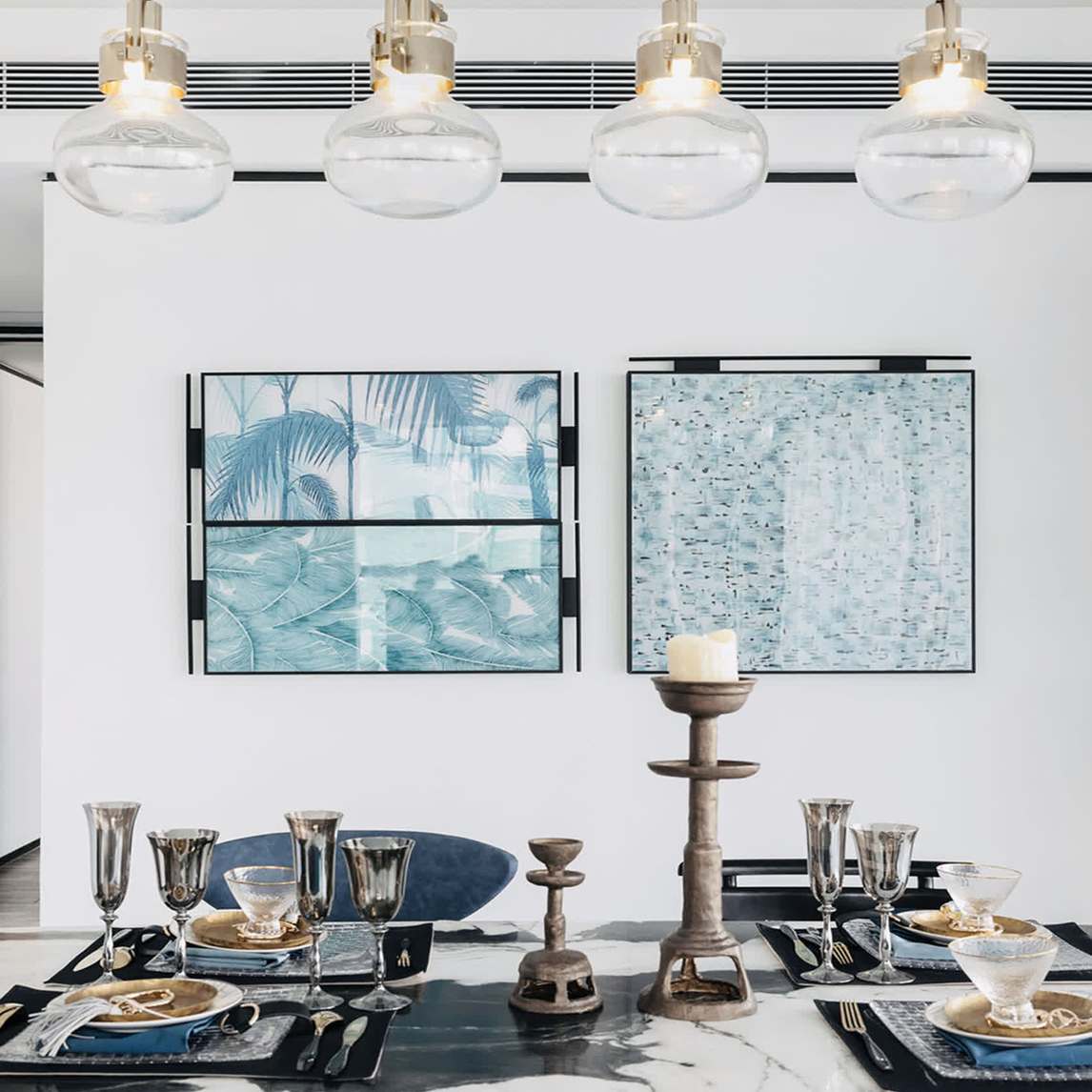这间复古风餐厅以白色和蓝色为主,给人清新、明亮的感觉。复古的吊灯营造出温馨的氛围。精致的玻璃餐具彰显出高贵品味。大理石台面给人庄重典雅之感。