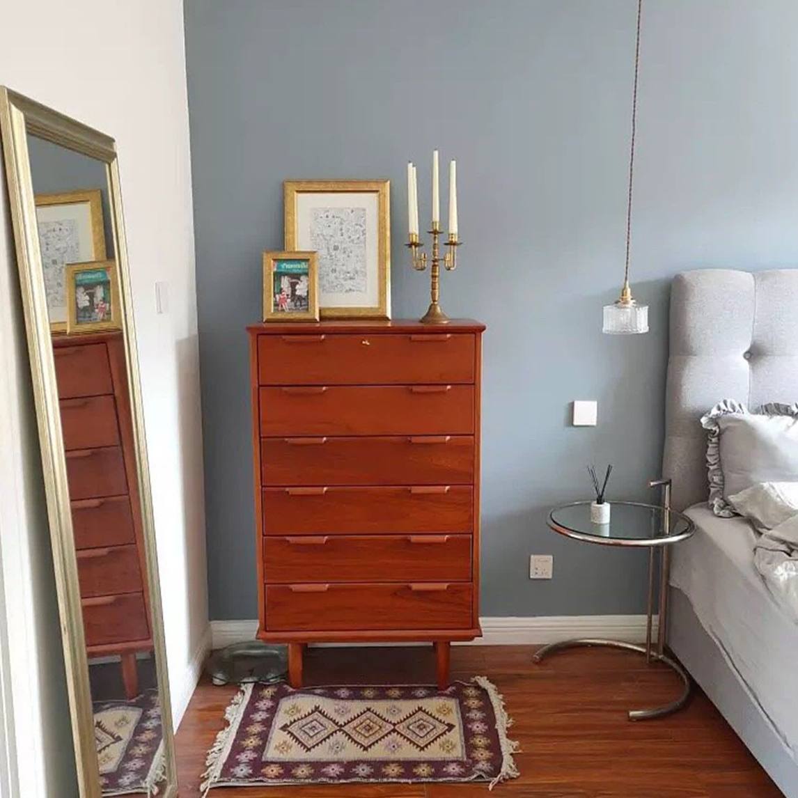 核桃木地板搭配红木斗柜,更具质感。多层红木柜拥有超大的收纳空间,满足日常收纳所需。金边穿衣镜和金边相框,低调奢华。