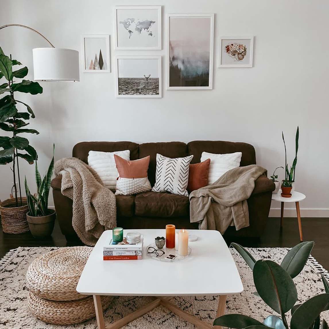 纯白的墙面点缀着各式各样的风景装饰画,让居住者心境更加开阔。随意摆放的绿植,展现出生机与活力。柔软的沙发和毛毯带给人温馨感。