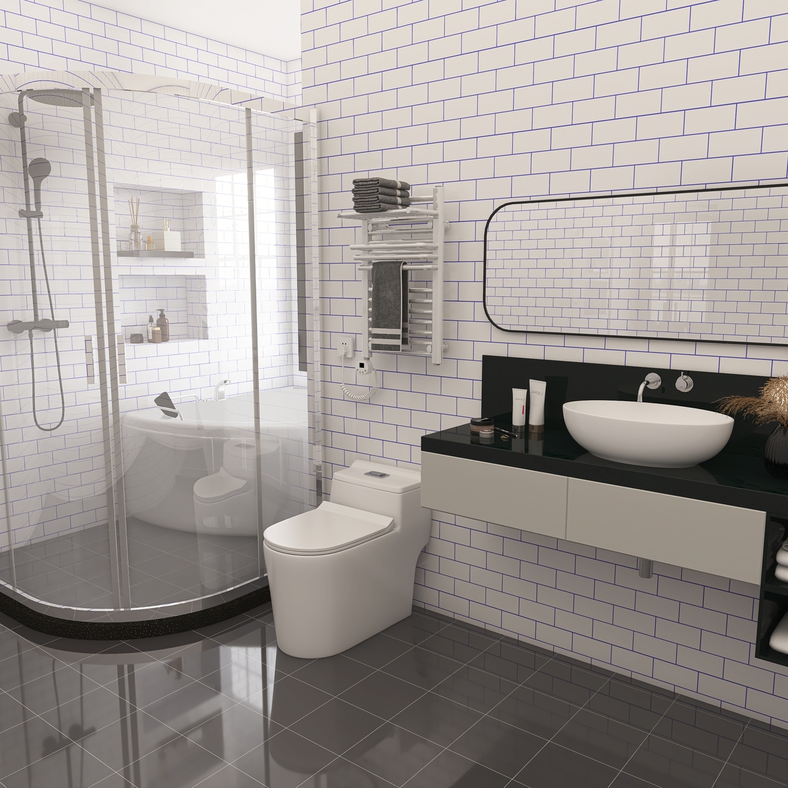 卫生间可以小,但绝对不能乱,合理运用每一寸空间,才能更好的享受生活,电热毛巾架是必备,能收纳能烘干还能保证毛巾浴巾的干燥洁净,整体淋浴房帮助干湿分离,才能让整个卫生间舒适又干净啊~