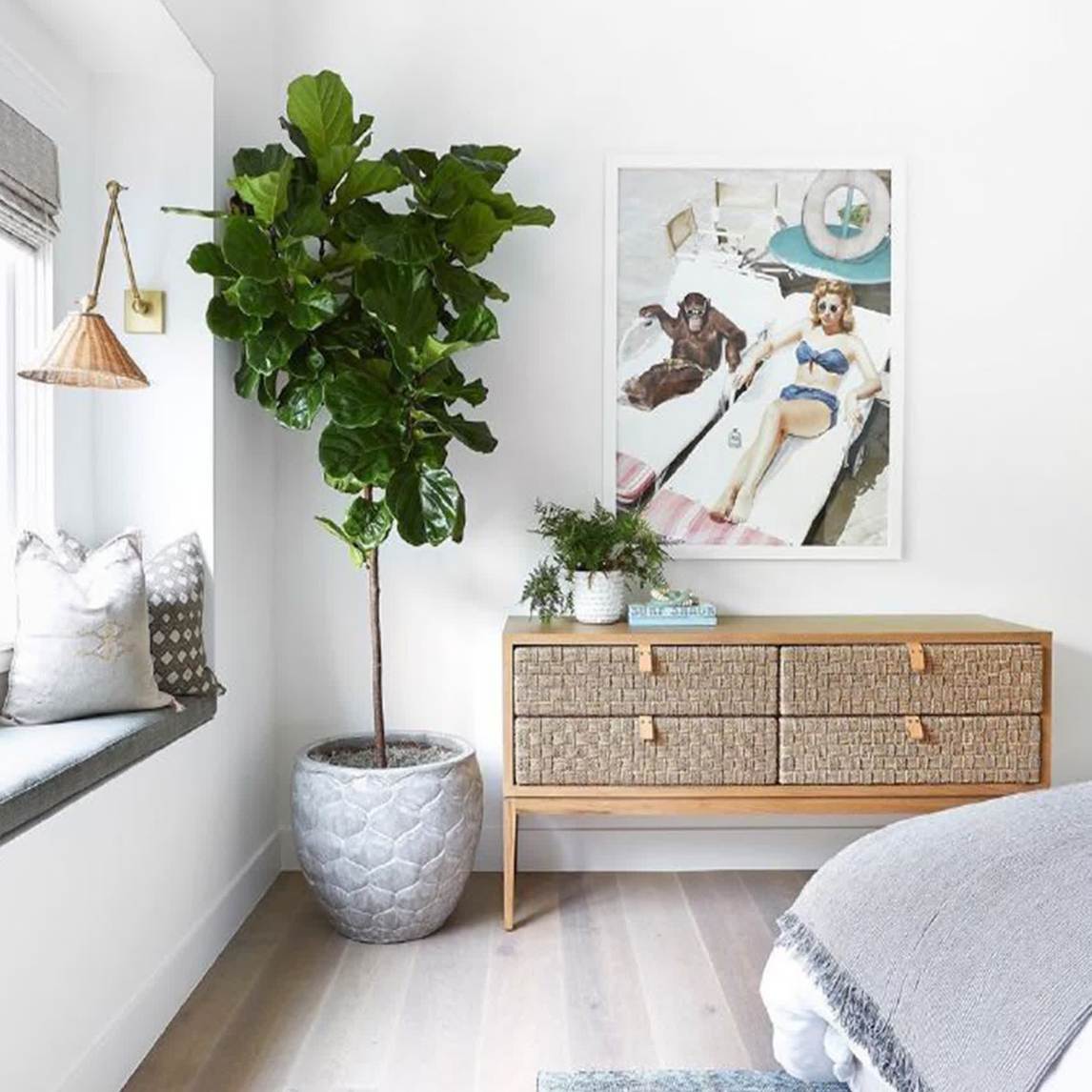 纯白的吊顶和墙面让卧室更加明亮、开阔。浅色系的家具凸显出温馨氛围。超大绿植点缀其中,带来自然的气息。墙面装饰油画浪漫、惬意。