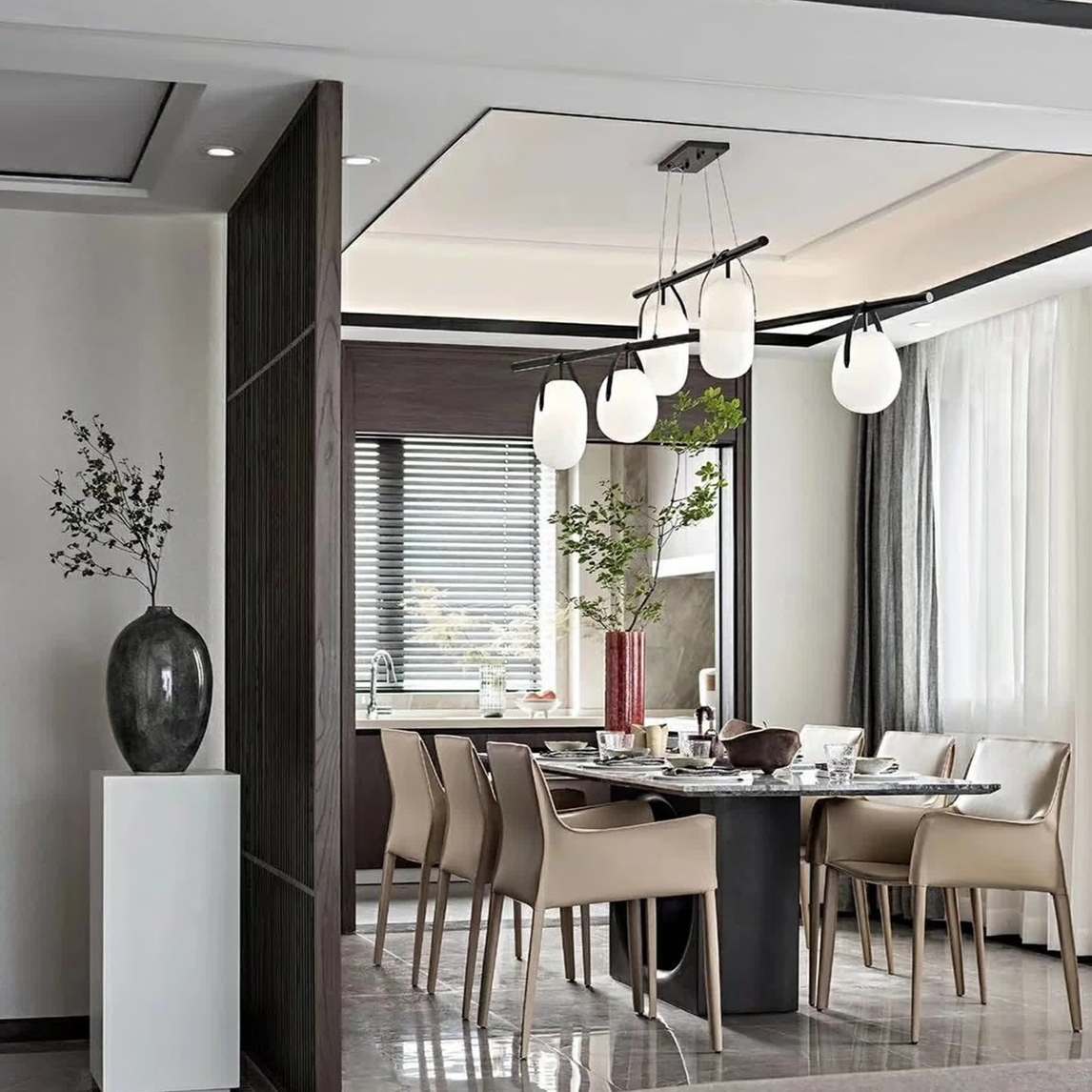 这间混搭风餐厅设计了两扇窗户,增大了采光面试,使得室内更加通透。皮质餐厅设计线条流畅,时尚前卫。灰色大理石地面使室内更加高级。