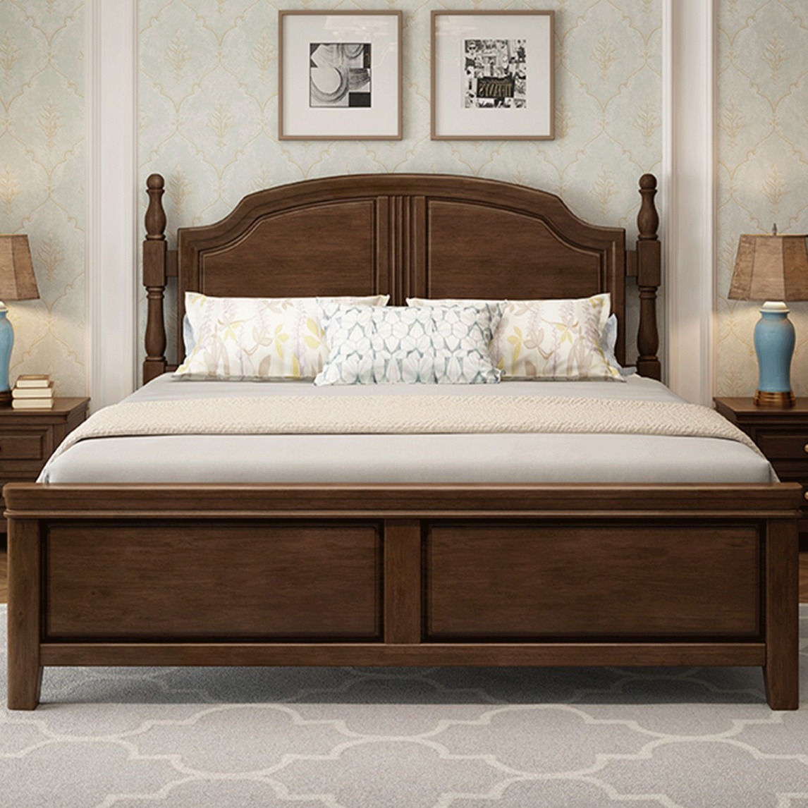 金典美式设计,线条流畅简约。实木采用进口橡木,结实美观层次感分明。既能提升整个卧室的格调,又能陪伴我们度过每一个夜晚。