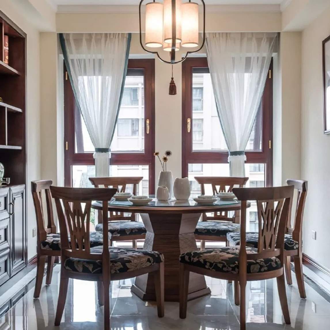 这间新中式餐厅家具线条流畅,更显立体感。嵌入式壁柜节省了室内空间,增大了收纳面积。家具花纹雕刻精美,使得餐厅更加精致。