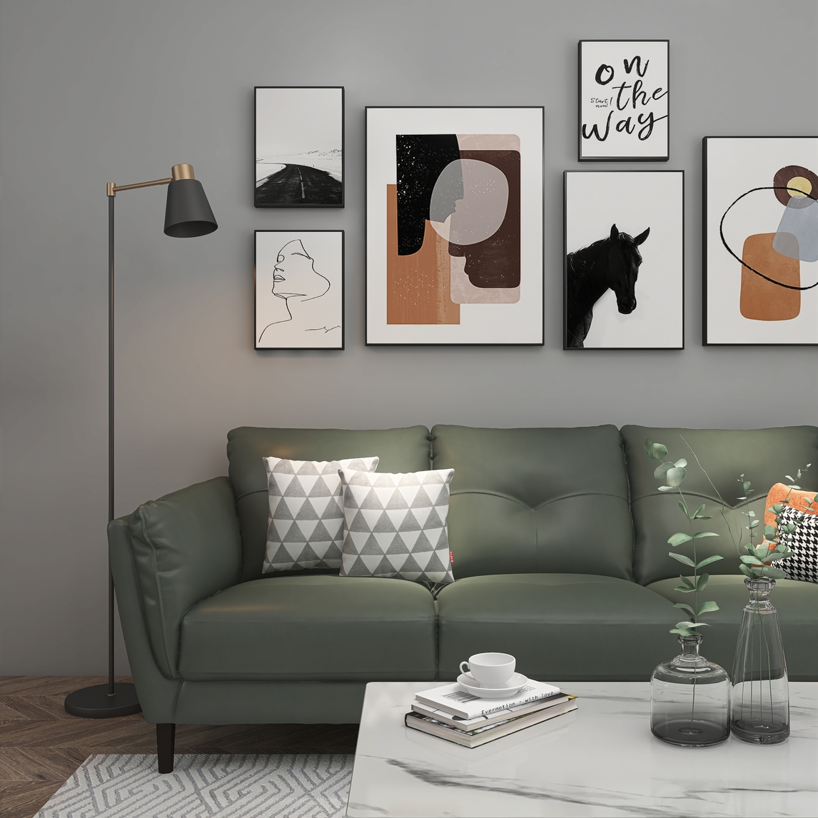文艺风满满的小客厅,灰色质感墙面搭配鱼骨纹木地板,简约中透露出设计师的一点小心机。沙发墙采用抽象装饰画点缀,增添浓郁的艺术气息,彰显屋主的高雅品位。 靠墙摆放一张墨绿色沙发,带有轻微复古的韵味,适当...展开