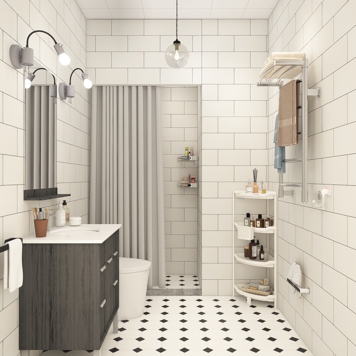 小小的卫生间却是生活中每天进出次数最多的地方,洗漱用品的收纳尤为重要。沐浴常用物品三角置物架摆放,方便且占用空间少,利用墙角平摆放多层置物架,避免拖鞋弄湿,可以挂在墙面拖鞋架上,再配个电热毛巾架,效果...展开