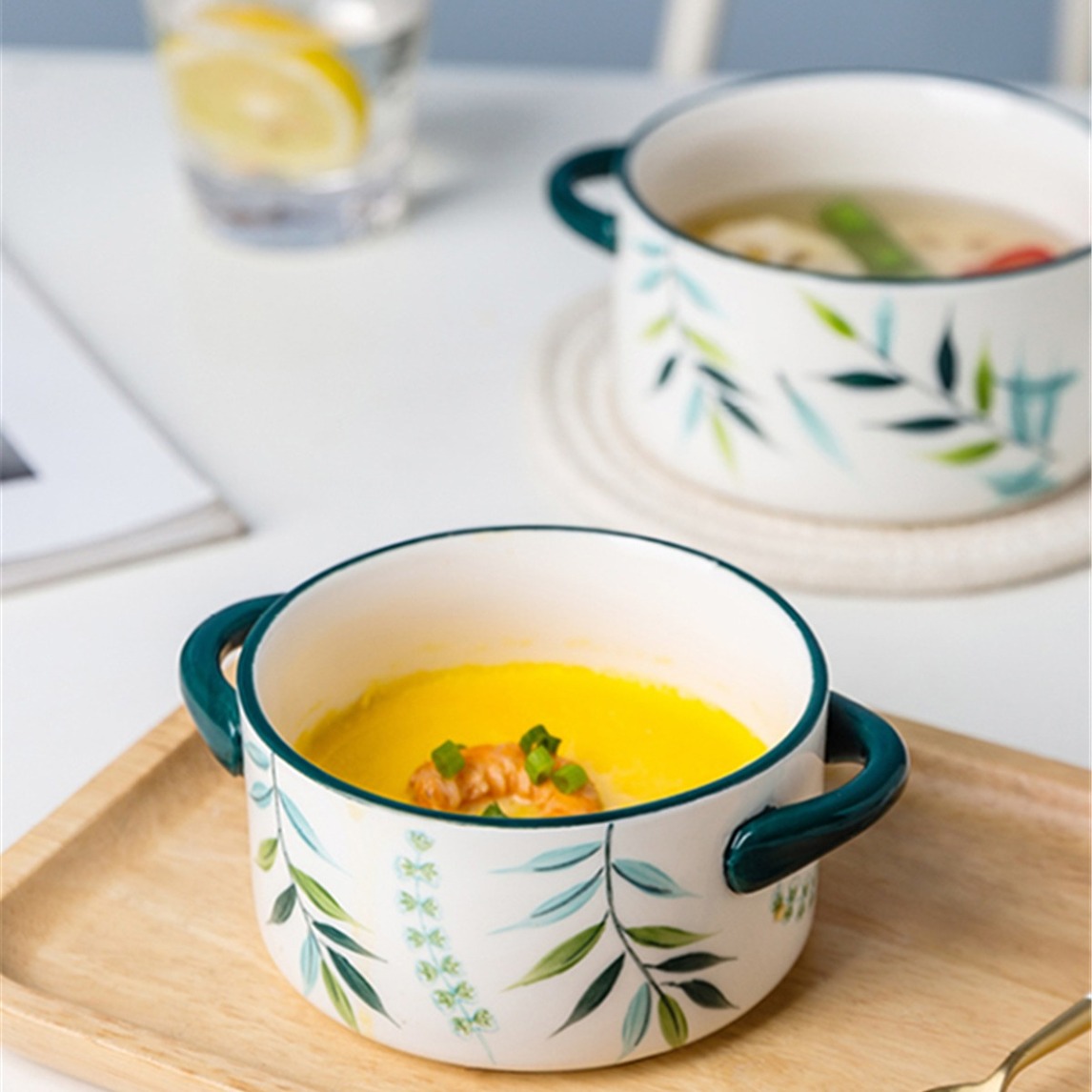 双耳汤碗提升餐桌的情调,带你遇见更美味的食物,匠心的手工绘制,给汤碗带来不一样的感觉,双耳设计不仅端拿平稳,而且看起来也很别致。