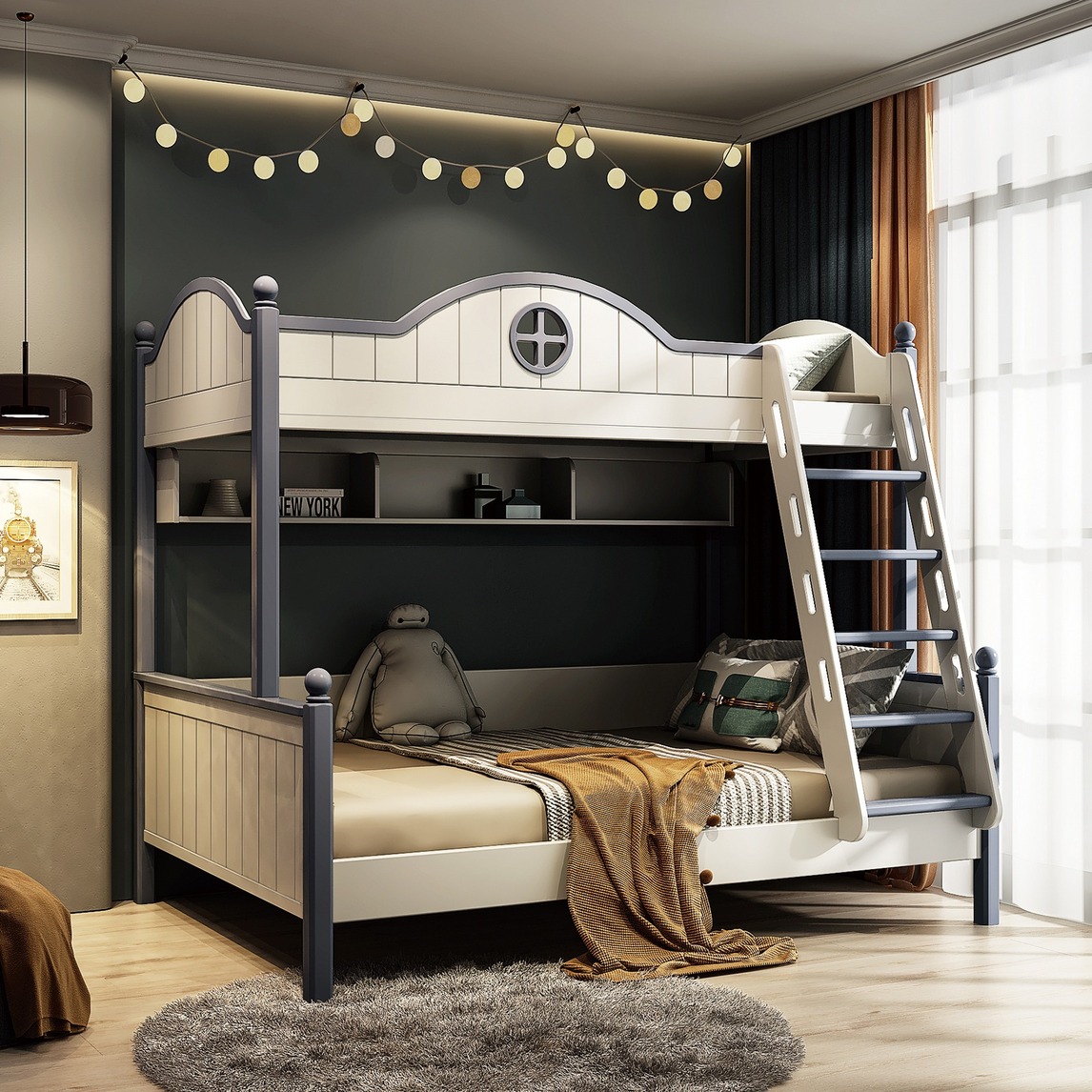 家里有俩娃,东西多,但是房间却很小,这是大部分家庭会存在的问题。所以对小户型来说,有一张储物性类型的床是很重要的。既可以睡觉又可以储物,一个空间两个位置。