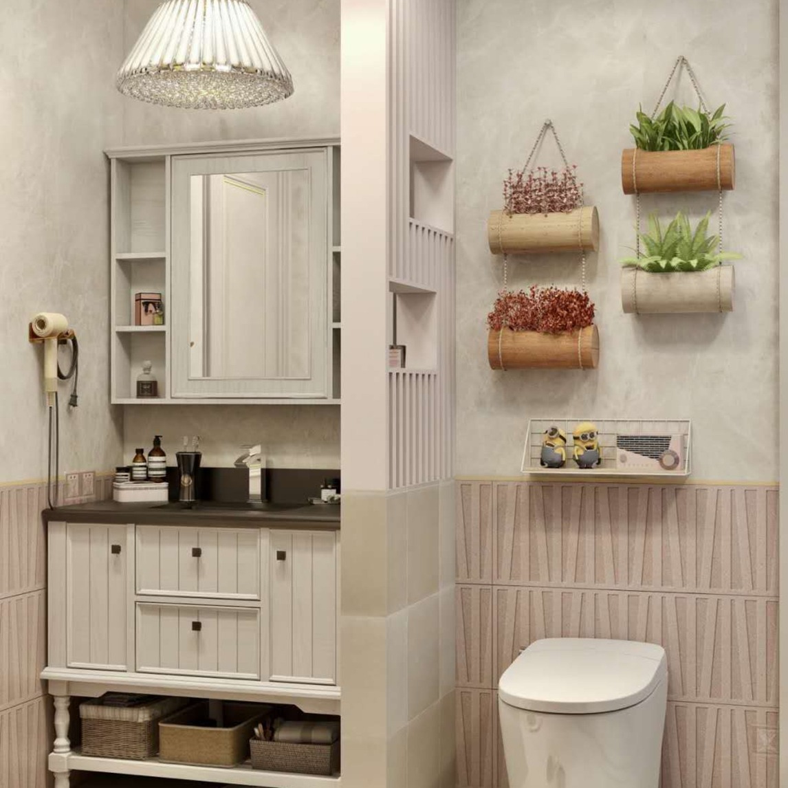 4平米的复古风浴室,做到了干湿分离,花洒背景做了拼花墙,显得更加好看;浴室柜,挂架增加了很多储物空间,让整个浴室既干净又整洁。