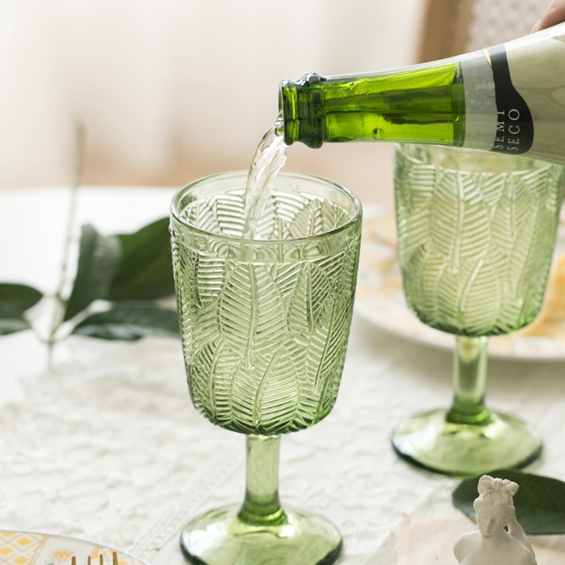 小清新风格的玻璃高脚杯,浮雕的叶子图案和绿色的玻璃材质相配。既清新而优雅~~玻璃为有色玻璃材质,非喷色,不掉色不褪色。