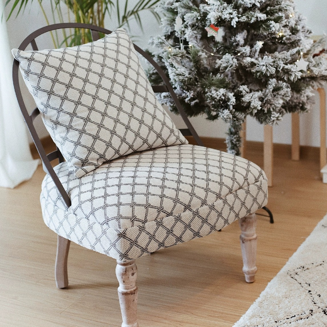 法式复古单人椅,菱形格子元素,棉麻布艺坐垫,铁艺实木框架,高密度回弹海绵,文艺复古风格,坐感舒适十足。
