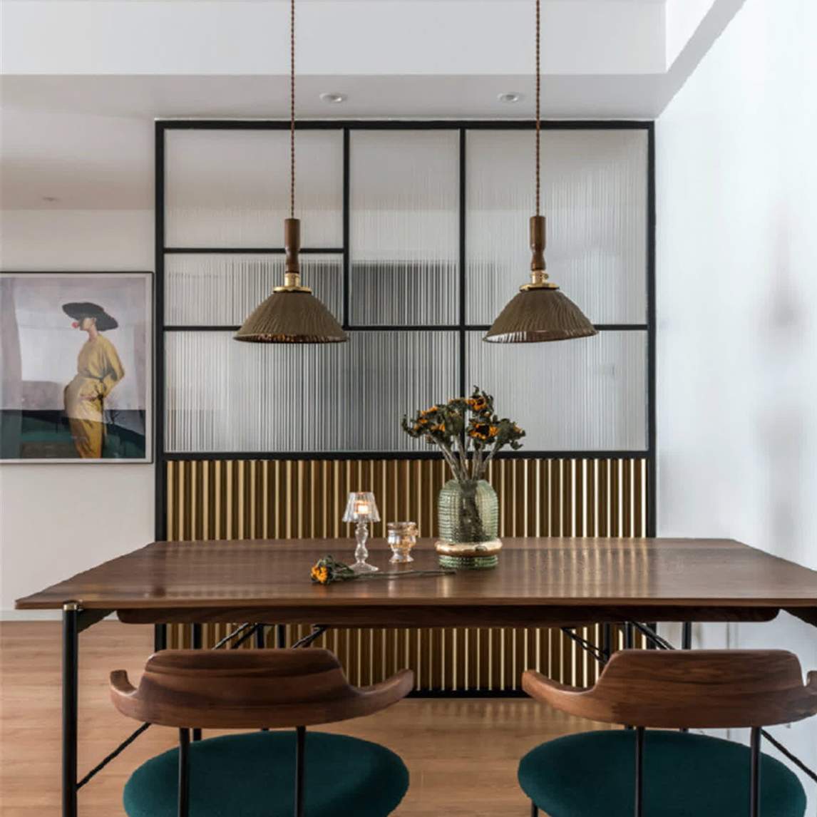 餐厅地板整体大面积使用木色和白色,自然舒适。木色的餐桌搭复古绿铁艺餐椅,轻松营造简单有质感的空间。点亮复古风格吊灯,餐桌上精致的台灯,怀旧的花瓶,让人重新回到旧时代,感受宁静舒适的氛围。