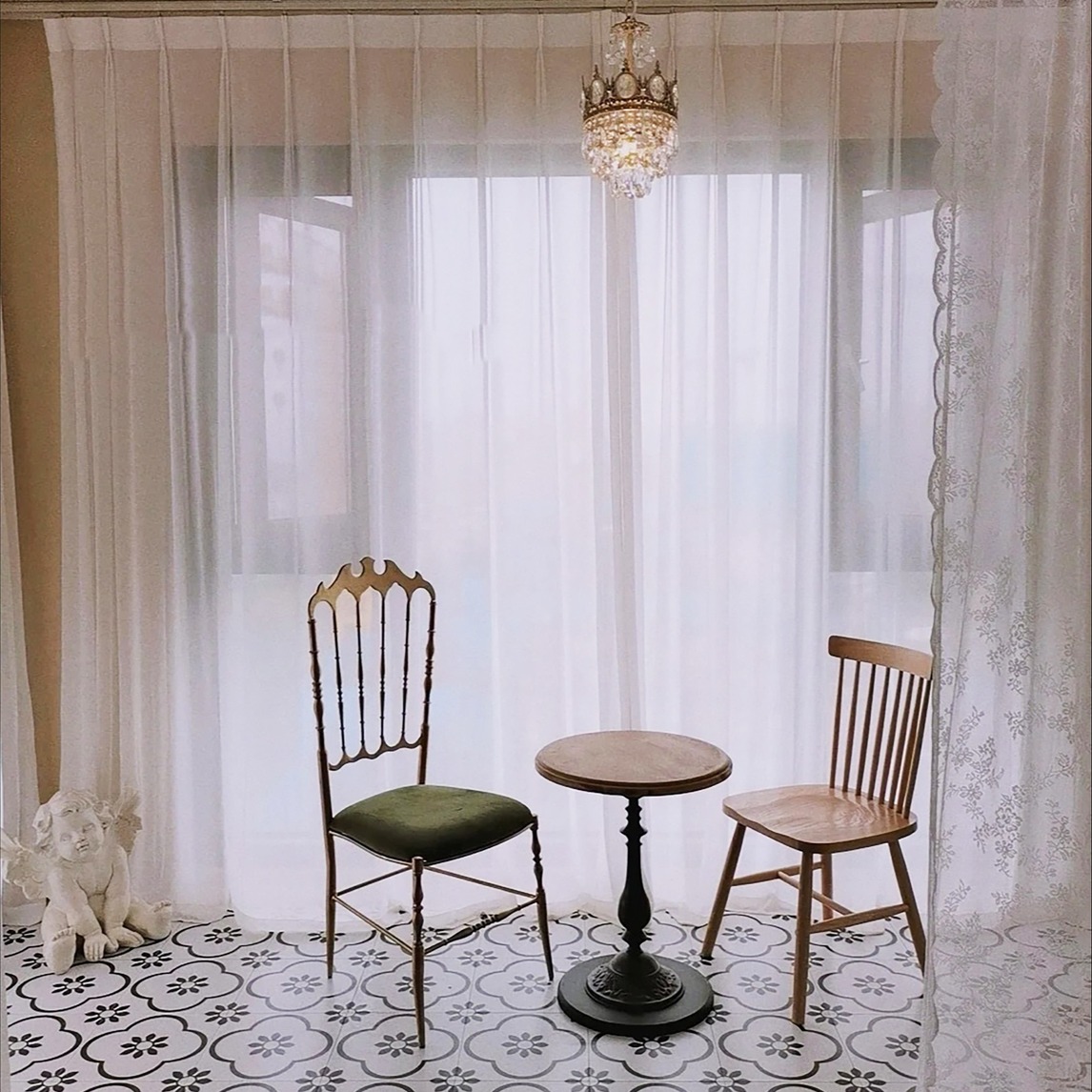 轻纱薄曼,将窗外的世界变得朦胧,屋内就是另一个独立的世界。一个小圆桌,几把凳子,我可以喝着花茶看着书,在艳阳高照的天气感受阳光的温暖,然后慵懒地进入白日的梦境里