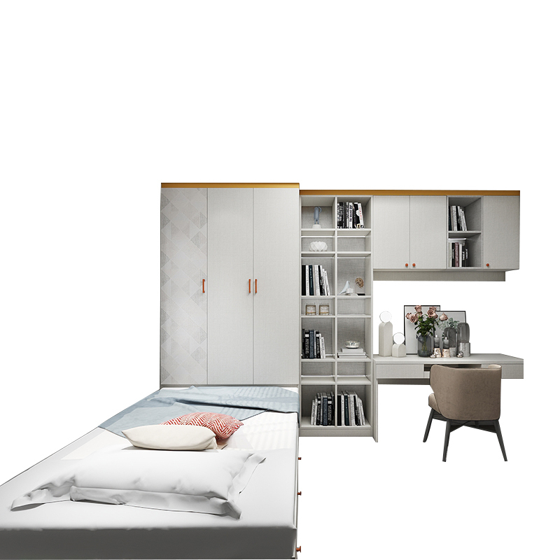 卧室搭配多功能榻榻米,既是休息区也是做工作学习区,还可以收纳各种物品,储存容量大。设计一个升降桌休闲空间就出来了,搭配上书桌一角的跳色点缀,整个空间简约而不单调。