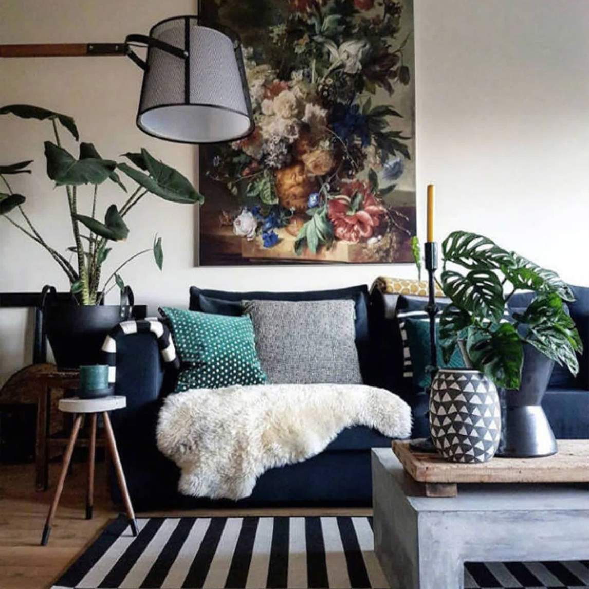 客厅一幅巨大的油画,极具色彩张力和美感。蓝色丝绒沙发搭配波点抱枕和羊毛毯,尽显复古高级感。黑白条纹的地毯,黑白格纹的花瓶,使整个空间文艺气息十足。