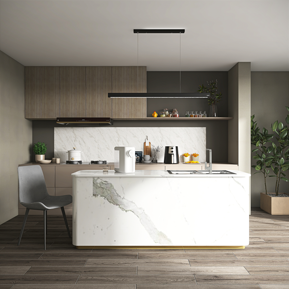 厨房以大理石纹和深灰色橱柜为主,整体效果光洁亮丽。在日光或灯光的照射下,让人感觉舒适又宽敞。中岛设计可以预留足够的备菜和蒸煮区域,同时也适用于小两口简单的用餐。柔白外观的美的饮水机,给予主人舒适宁静的...展开