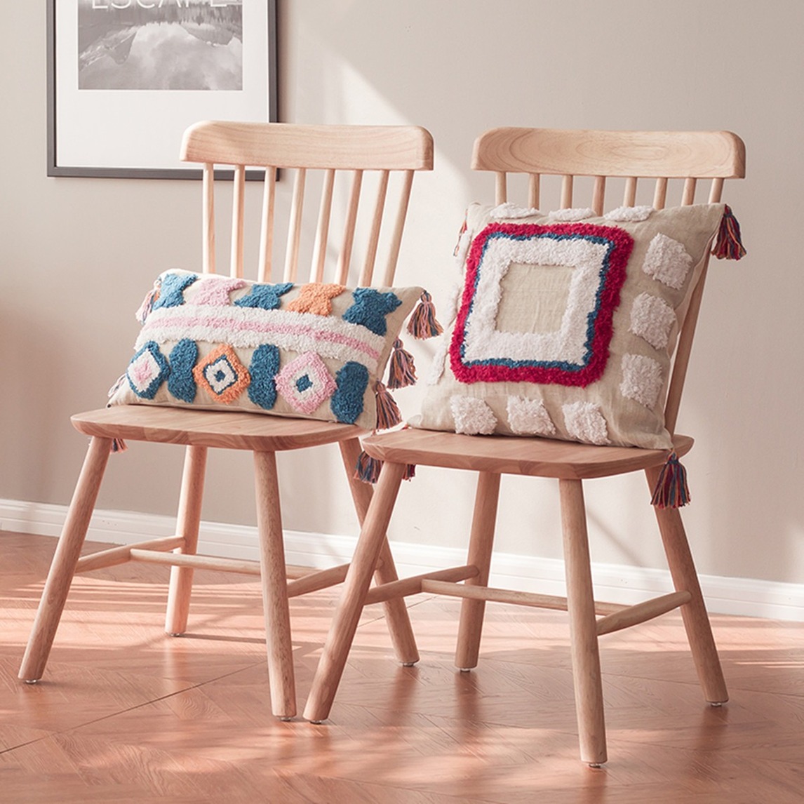 是北欧风的整体布置,但是这两个抱枕就好像外来生物一样,却格外有趣,摩洛哥风格元素,簇绒装饰个性精致,小流苏好可爱。