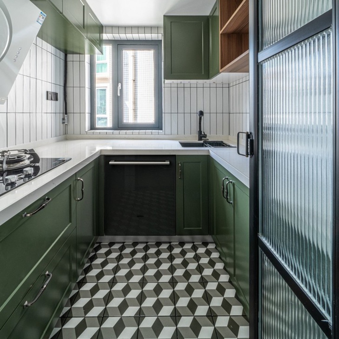 长虹玻璃和小白瓷砖里外呼应,使厨房整体简洁明亮。墨绿色橱柜搭配做旧的金属把手,透露出一种复古时尚的感觉。U型橱柜充分利用了空间,让操作更加方便。