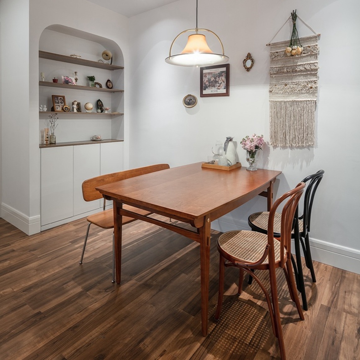 要说家人幸福感最强的空间,那一定是餐厅了。弧形的餐边柜造型特殊,活跃了餐厅的气氛。做旧的老木色色调和金属吊灯,拿捏了复古腔调。跳色的藤椅餐椅,成为了画龙点睛之笔,老照片挂在墙面,组成一幅照片墙,颜值与...展开